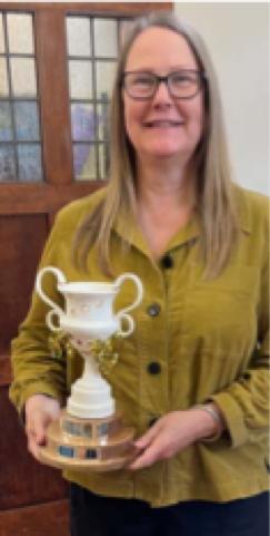 Fenella Mowbray, winner of the 2025 Fitzwilliam prize, with the new trophy, with which was Nicole Lyster’s prize winning entry in the 2024 competition.